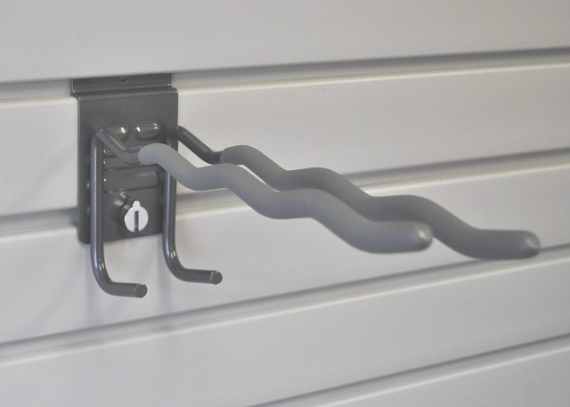 Notes: Unique design for difficult storage problems - Upper and lower double prongs provide for a multitude of item placement options. Ideal for log handled tools such as rakes, shovels, hoes, post hole diggers, etc. Includes lock in place TurnLock mechanism to prevent item from sliding in slot. Will work with HandiWall or any other standard slatwall product using slots on 3 inch centers or can be attached to any solid surface utilizing the provided screw-hole.