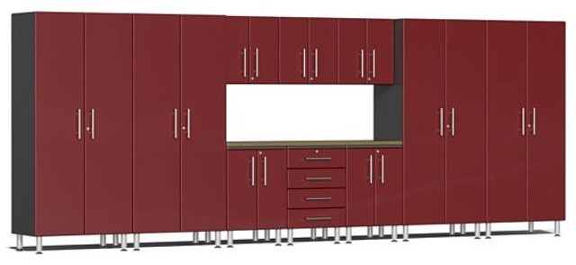 Ulti-MATE Garage 2.0 Series takes the back-to-back Consumers Digest awarded “Best Buy” cabinet line features to the next level. This popular eleven (11) piece kit with workstation provides nearly 24-ft of infinite design options on single or multi-wall designs (17.74-ft as pictured) and organization variety to get any room clutter-free quickly. Metallic gloss car-like color facing, industrial strength 1-inch thick shelves, smooth operating ball bearing drawer glides, soft-close hinges and radius profile are a few features that make this show-off worthy.