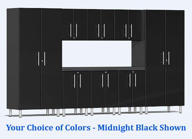 Ulti-MATE Garage 2.0 Series takes the back-to-back Consumers Digest awarded “Best Buy” cabinet line features to the next level. This nine (9) piece kit with workstation provides oversized shelf organization for those not needing drawer storage. Nearly 18-ft of infinite single or multi-wall expandable design options (pictured 11.83 ft). Metallic gloss car-like color facing, industrial strength 1-inch thick shelves, soft-close hinges and industry unique style are just a few features that makes this a perfect solution for any project.